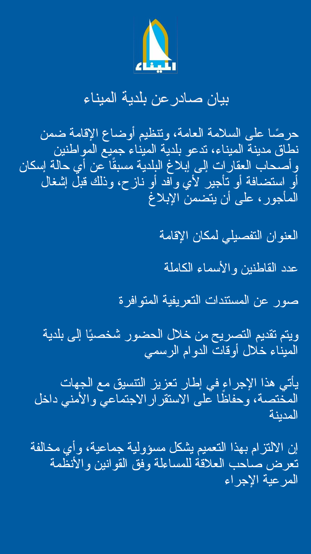 حرصًا على السلامة العامة، وتنظيم أوضاع الإقامة ضمن نطاق مدينة الميناء،