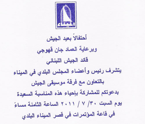 الزمان: السبت في 18 حزيران 2011 الساعة السادسة مساءً المكان: باحة كنيسة سيدة النجاة- الميناء- شارع فرح أنطون |