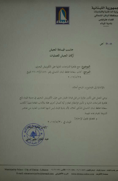 اهلنا في الميناء وطرابلس بعد ازالة المخالفات التي منعت العائلات من التردد على الكورنيش البحري في السنوات السابقة، نريد ان نطمئنكم ان الواقع الجديد وبعد تأمين الأمن اللازم من كل القوى مشكورة، الجيش اللبناني، الأمن العام، الأمن الداخلي والشرطة البلدية، موجودين على طول الكورنيش ومدينة الميناء لضمان راحة وسلامة اهلنا وزوارنا من اليوم وصاعداً. |