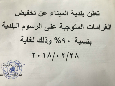 تعلن بلدية الميناء عن تخفيض الغرامات المتوجبة على الرسوم البلدية بنسبة ٩٠ % وذلك لغاية ٢٨\٢\٢٠١٨ |