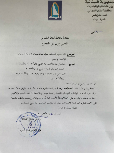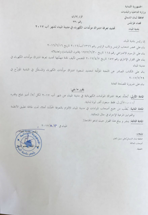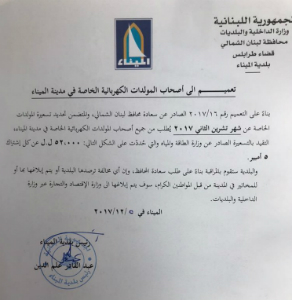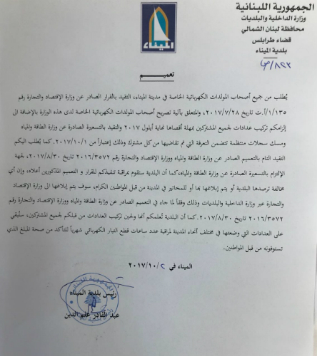 تعميم الى اصحاب المولدات الكهربائية في مدينة الميناء |
