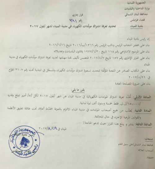 | تحديد تعرفة اشتراك مولدات الكهرباء في مدينة الميناء لشهر ايلول 2017 | ||||||||||