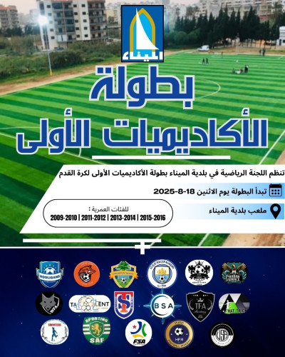 تحت رعاية اللجنة الرياضية في بلدية الميناء برئاسة الأستاذ ضياء أنطون وبمشاركة جميع أعضاء اللجنة ، إنطلقت بطولة الأكاديميات الأولى لكرة القدم وذلك ابتداءً من صباح اليوم الإثنين 18 آب 2025 على ملعب بلدية الميناء، على أن تستمر المنافسات لمدة شهر كامل.