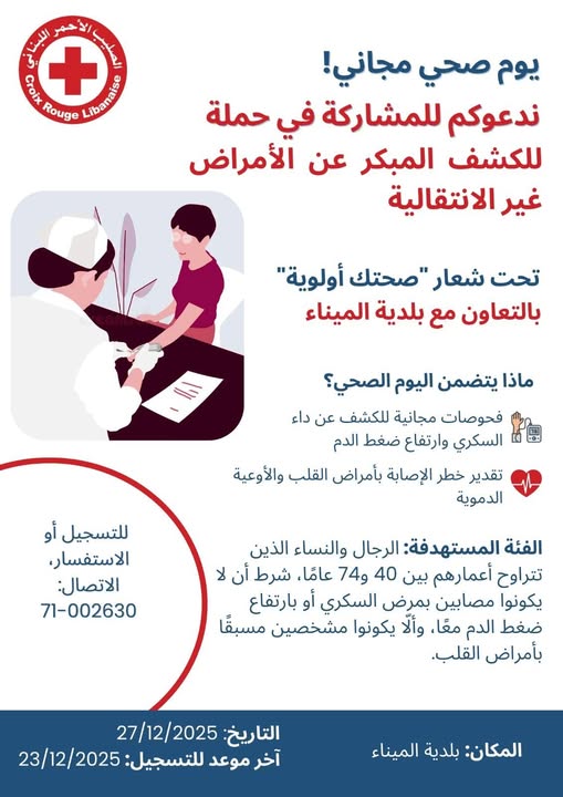 الصليب الأحمر اللبناني بالتعاون مع بلدية الميناء يدعوكم للمشاركة في حملة للكشف المبكر عن الأمراض غير الإنتقالية. للتسجيل أو الإستفسار يرجى الإتصال على الرقم 71/002630 |